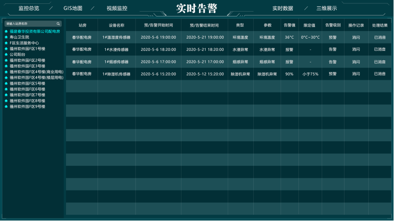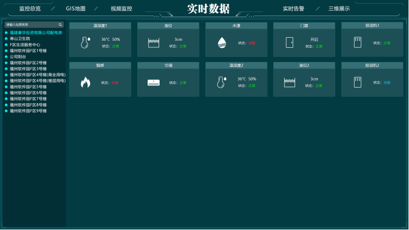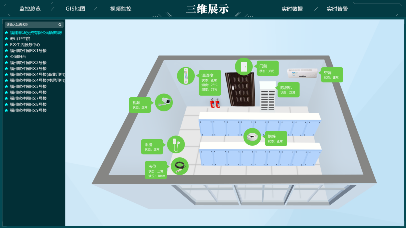 动力环境监控系统通过使用温湿度传感器、水浸传感器、烟感传感器、门禁传感器、液位传感器、空调传感器、除湿机等设备对分布的各个独立的动力设备和机房环境、机房安保监控对象进行遥测、遥信等采集,实时监视系统和设备、安保的运行状态,记录和处理相关数据,及时侦测故障,并作必要的遥控、遥调操作,适时通知人员处理;实现机房的少人、无人值守,以及电源、空调的集中监控维护管理,提高供电系统的可靠性和通信设备的安全性,为机房的管理自动化、运行智能化和决策科学化提供有力的技术支持。其主要功能包括:监控总览、实时告警、三维展示、GIS地图、视频监控、实时数据等。